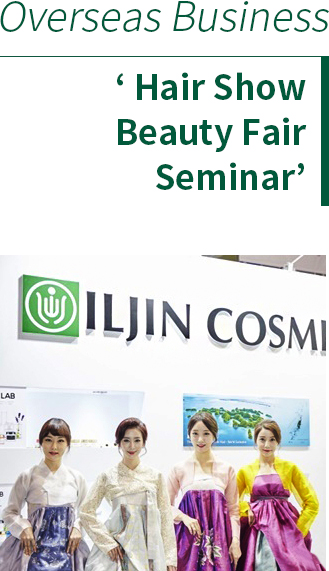 ILJIN Cosmetics' overseas marketing business is helping to expand the market, as well as paving the way for improving sales and enhancing the external image of the company through overseas market development. It is an investment for 100 years, 200 years and the future, and it is a key driving force for the growth of the company which is growing in the world. Especially, we have established a local corporation in Beijing, China, Korea has been growing rapidly in the Korean cosmetics market, mainly in the ASEAN region, and has recently grown into the European cosmetics market. With respect to environment, health and well-being, We are actively promoting the brand through overseas famous cosmetics fair. ILJIN Cosmetics is a global brand that has been recognized for its global growth potential and has accumulated know-how close to half a century, highly productive, Through exchanges, we will do our utmost to create new markets, guarantee quality and secure competitiveness.